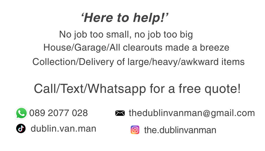 Good value Man with a van service for the entirety of Dublin and beyond.Centrally located in Dublin 8No job too big or small!High capacity twin-rear wheel with interior lighting and insulation for the safest moving conditions.We're here to help; a friendly service with someone who cares!House/Garage/Shed clearouts - moves - transport, courier deliveries, IKEA deliveries and beyond! You name it, we do it!